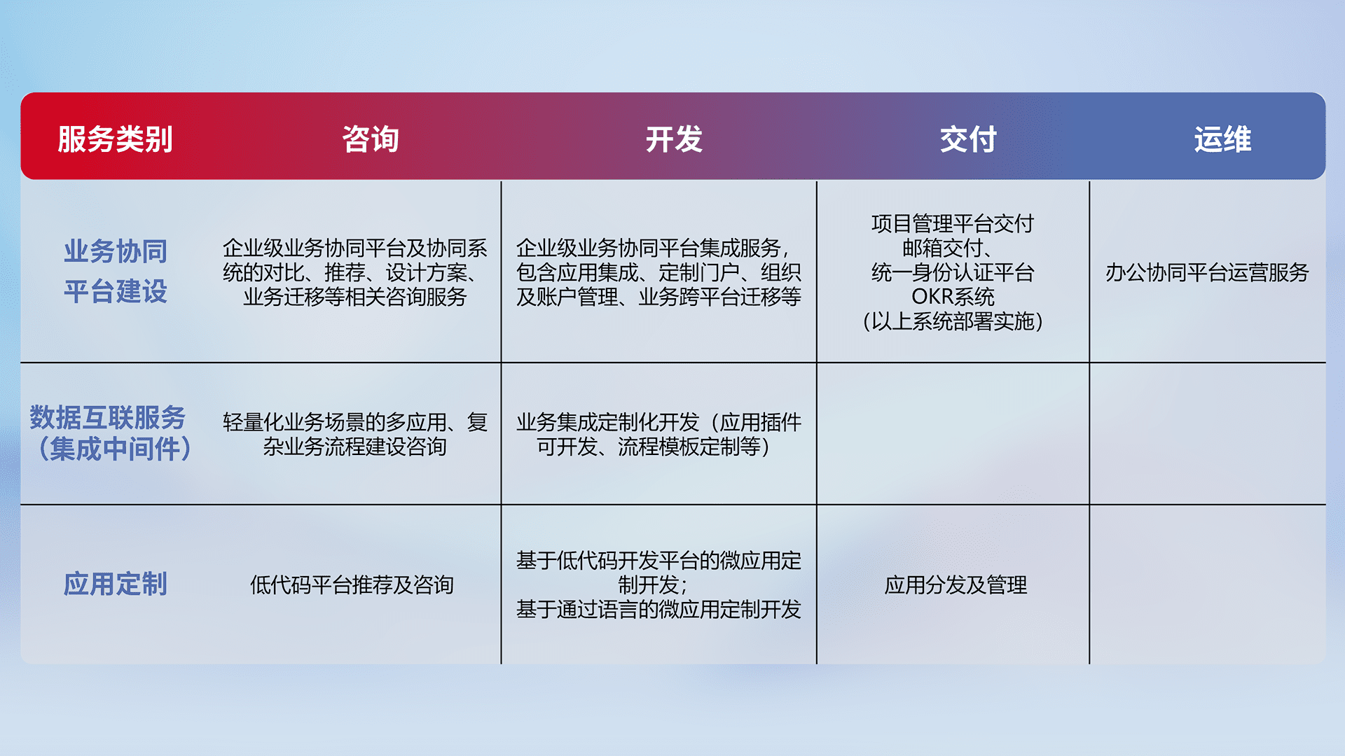针对钉钉、、企微、、、、IDaas等平台级产品提供产品的规划、、、、方案、、交付、、、、定制化开发等服务,,,实现如统一协同办公、、、智能客户服务、、、混合会议管理、、智能数据查询、、、等业务场景,,,,实现数字化转型。。
